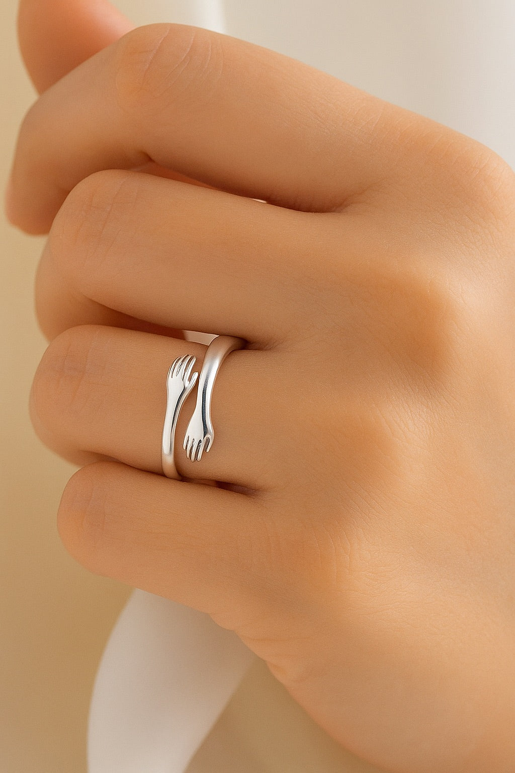 Anillo ajustable fabricado en acero inoxidable, diseñado para simbolizar un abrazo cálido y reconfortante. Su forma envolvente representa cariño, apoyo y conexión, convirtiéndolo en un accesorio perfecto para regalar a alguien especial o para autor regalarse como un recordatorio de amor propio.