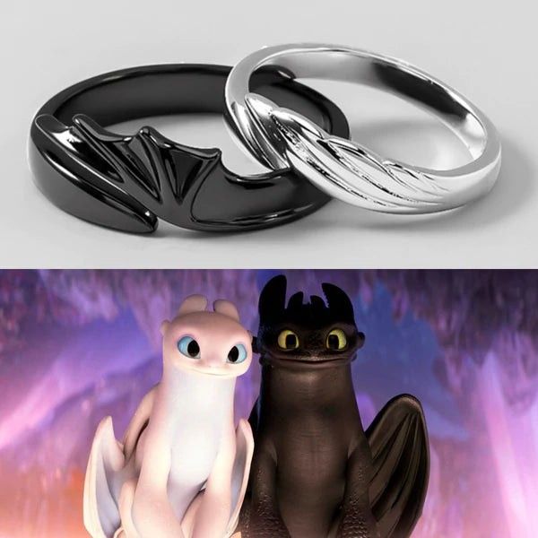 Par de anillos inspirados en los dragones Chimuelo y Furia Luminosa, ideales para parejas, amigos o personas especiales. Cada uno representa un dragón, simbolizando conexión, equilibrio y lealtad. Su diseño permite que se usen juntos o por separado.