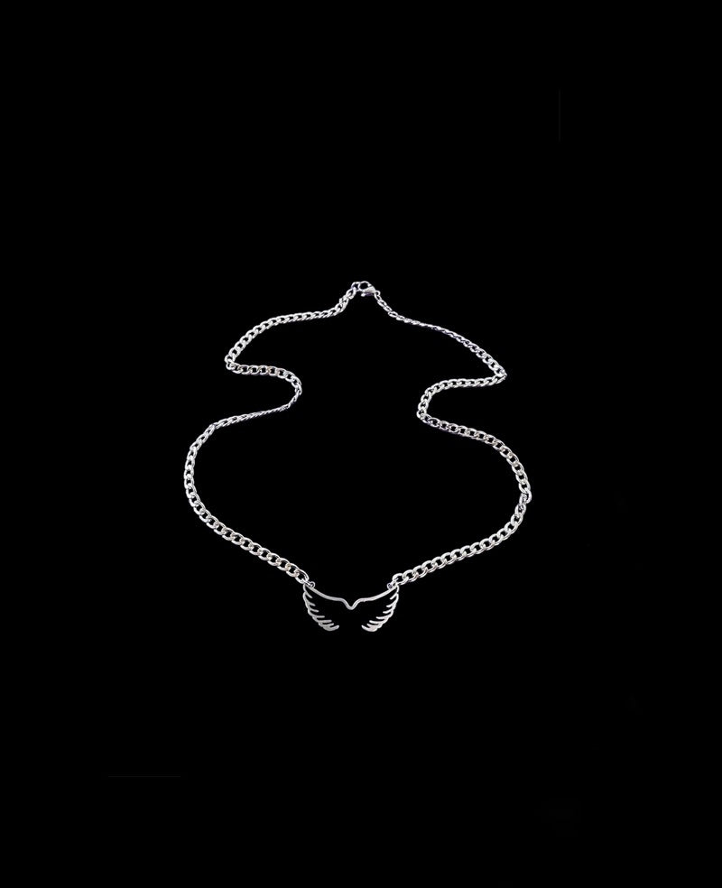 El Collar Alas de Ángel está inspirado en el icónico diseño de los tatuajes de Duki, con una estética limpia y elegante. Su pulido espejo resalta los relieves del ala, logrando reflejos brillantes y una presencia visual llamativa sin ser exagerada.